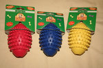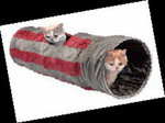 Een kleine krabpaal van zwart sisal met kleurige details en bodemplaat.